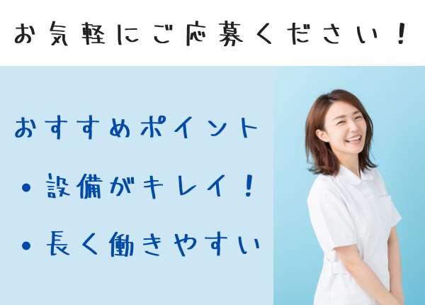 | 仕事内容 | 外来での看護助手業務◇患者さんの案内・誘導◇物品の補充・準備◇清掃◇その他... |